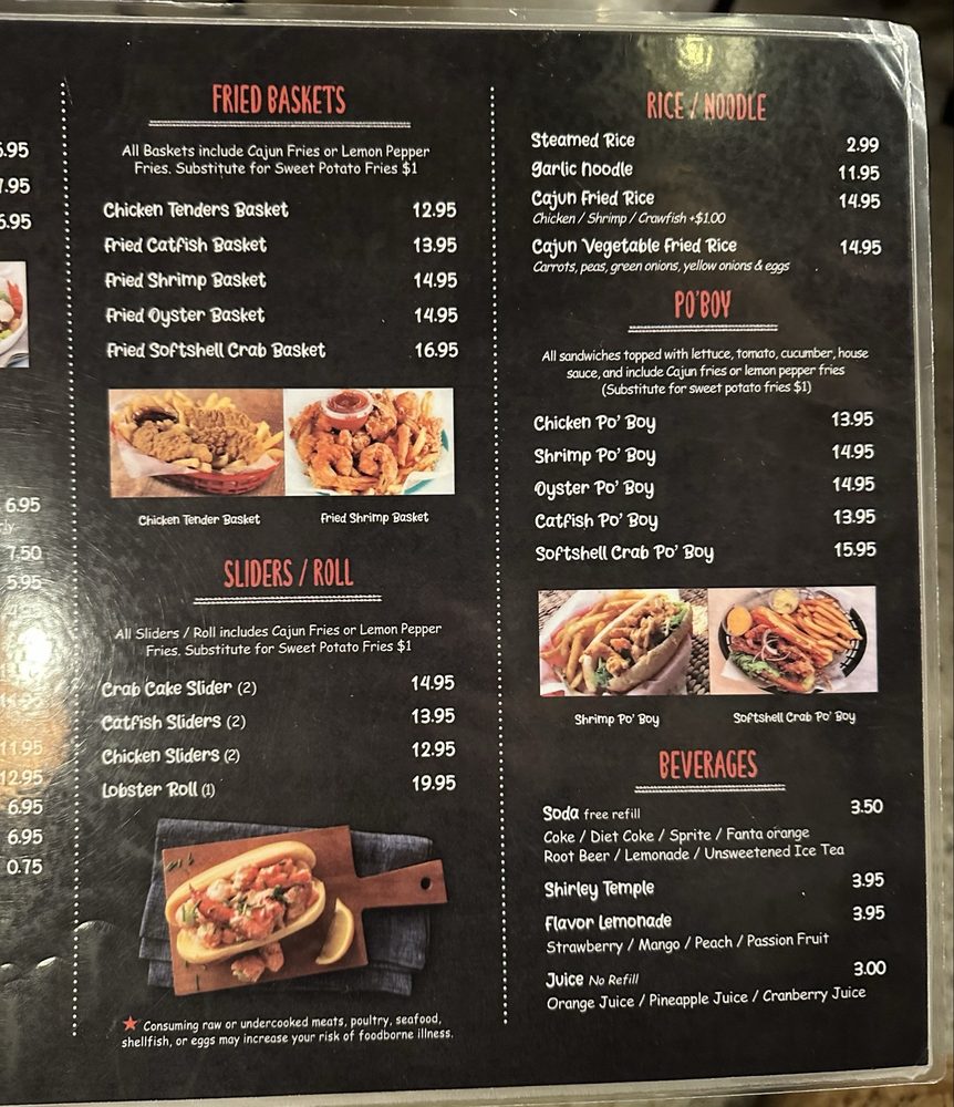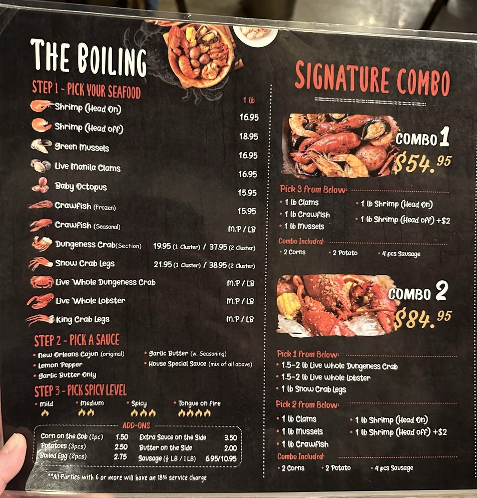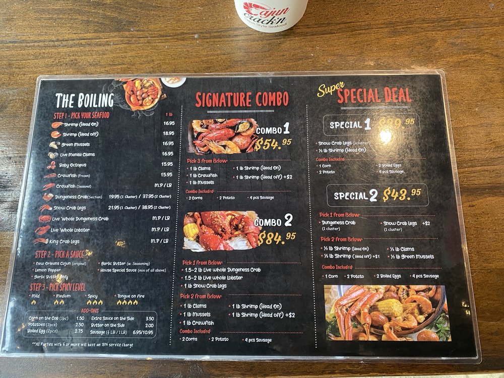 “ Short wait under 10 mins on a Sunday evening. Plenty of parking in lot. Service was great, food was served quickly, restaurant is pretty spacious with lots of seating. My party of 4 shared the Special 2 (chose Dungeness crab, 1 lb clams, added extra corn), 2 pounds of shrimp, fried okra, garlic noodles, Cajun curly fries, and house oysters. We chose the house special sauce with medium heat level which wasn't that spicy. Everything was delicious, no complaints! Especially liked the shrimp, Cajun curly fries, and house oysters. Definitely a solid spot for seafood boil and it's a huge plus that there's plenty of seating and doesn't feel overcrowded. ”
